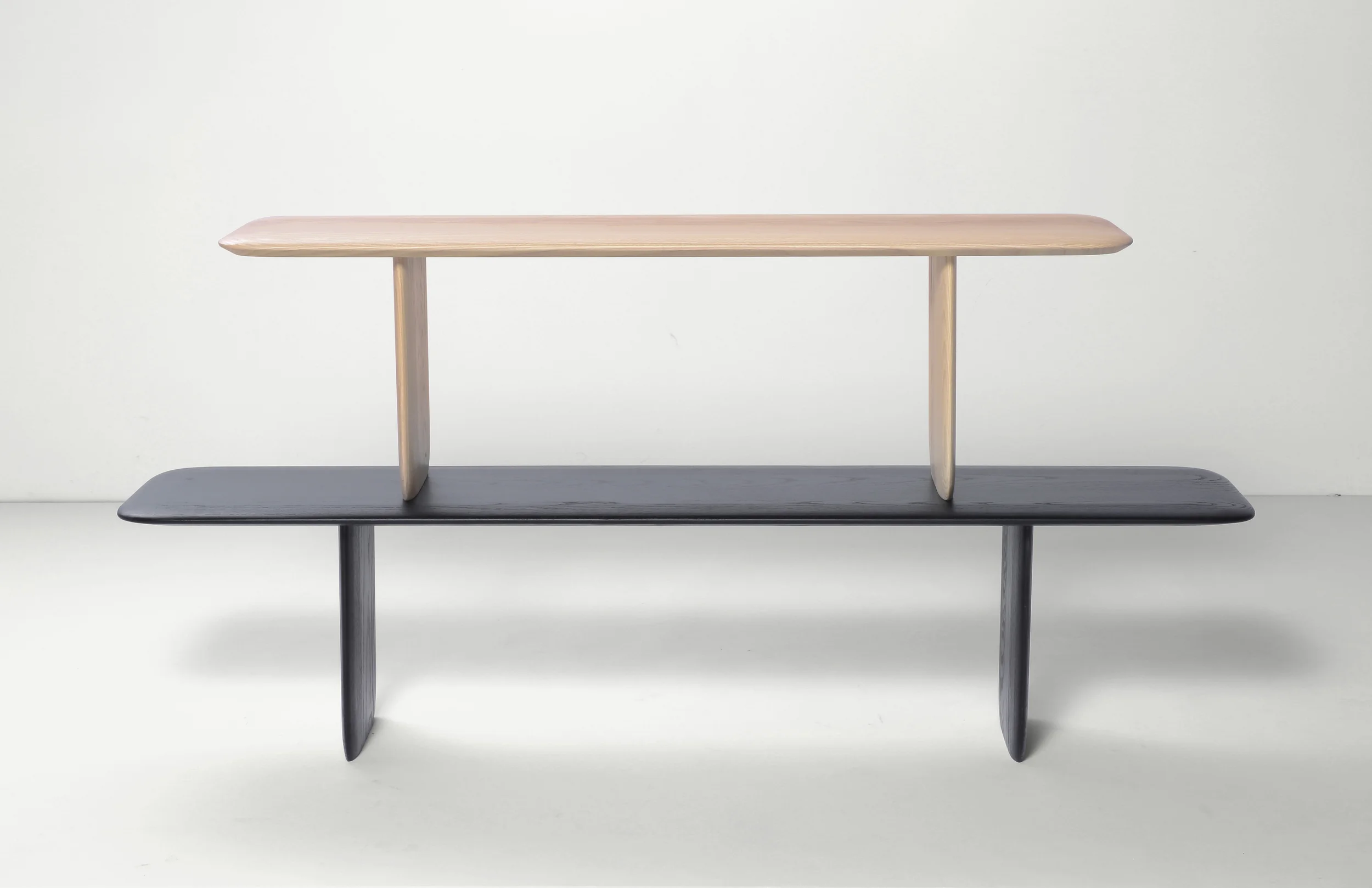 The Poise Collection for Council Inc. comprises a table, a bench, and a stool. The table's surface is made up of three wood and stone panels that hardly seem to touch, creating an impression of weightlessness and buoyancy. Each panel is softly contoured, inviting the touch of the hand and encouraging casual use.