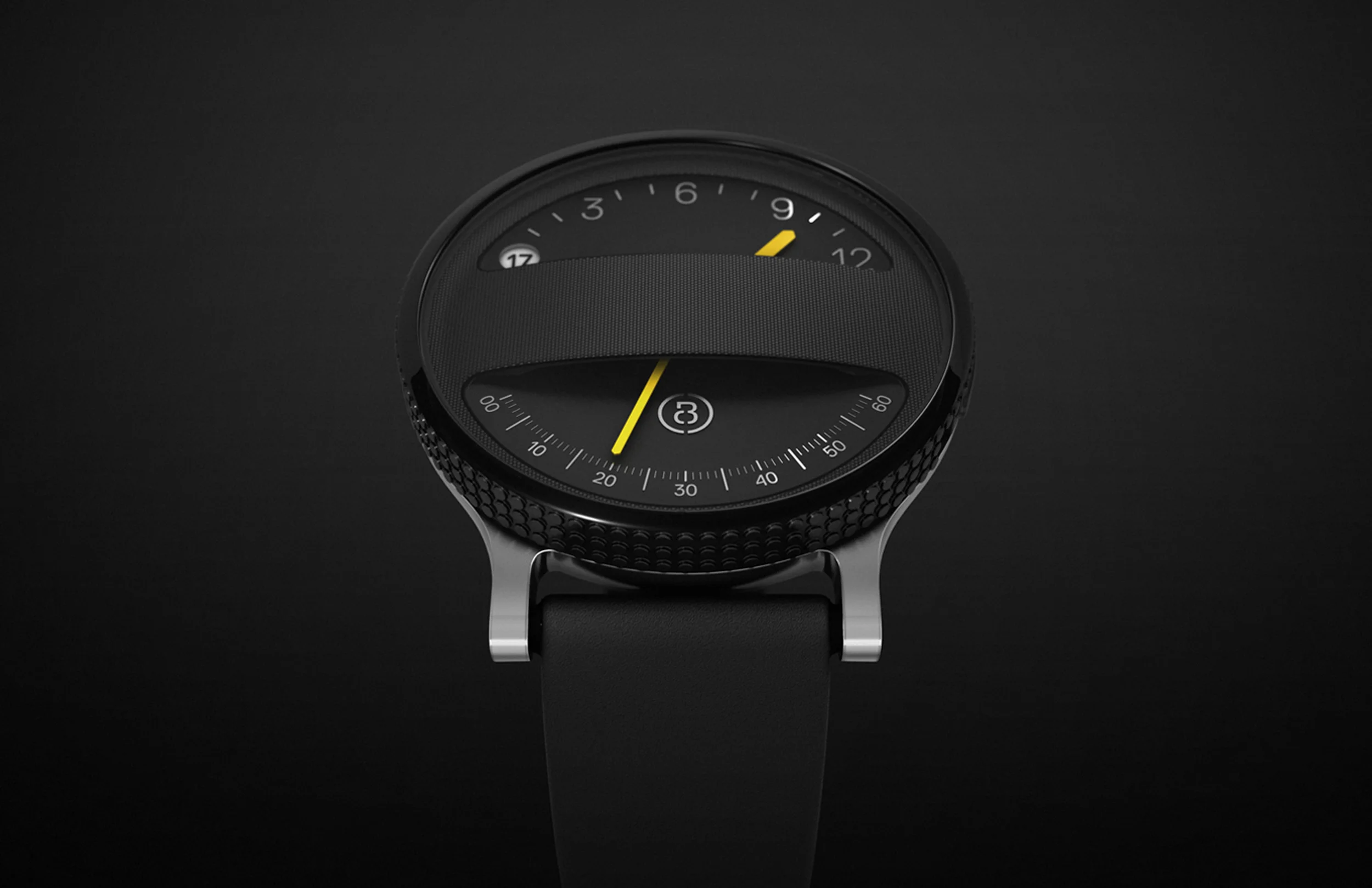 Made of polished stainless steel and sleek black ceramic, Span's interface is navigated with a jog dial on the bezel. Span's jump hour timekeeping operates on a quartz movement; the digital components can be recharged with a micro-USB charging port concealed in the back of the watch.